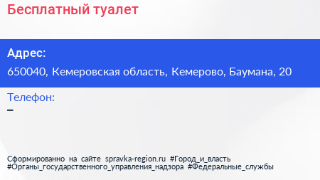 Бесплатный туалет по адресу 650040, Кемеровская область, Кемерово, Баумана, 20 в дальнейшем Организация, размещена в следующих категориях: