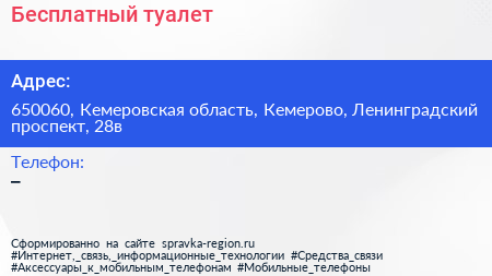 Бесплатный туалет по адресу 650060, Кемеровская область, Кемерово, Ленинградский проспект, 28в в дальнейшем Организация, размещена в следующих категориях: