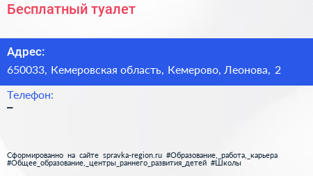 Бесплатный туалет по адресу 650033, Кемеровская область, Кемерово, Леонова, 2 в дальнейшем Организация, размещена в следующих категориях: