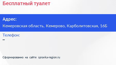 Бесплатный туалет по адресу Кемеровская область, Кемерово, Карболитовская, 16Б в дальнейшем Организация, размещена в следующих категориях: