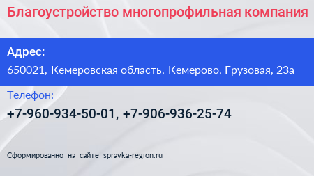 Благоустройство, многопрофильная компания по адресу 650021, Кемеровская область, Кемерово, Грузовая, 23а в дальнейшем Организация, размещена в следующих категориях:
