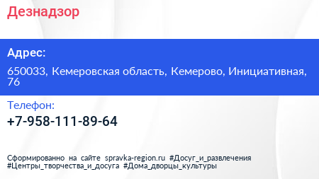 Дезнадзор по адресу 650033, Кемеровская область, Кемерово, Инициативная, 76 в дальнейшем Организация, размещена в следующих категориях:
