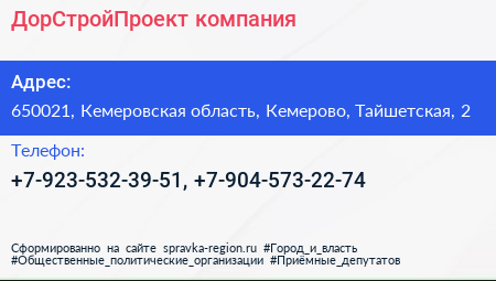 ДорСтройПроект, компания по адресу 650021, Кемеровская область, Кемерово, Тайшетская, 2 в дальнейшем Организация, размещена в следующих категориях: