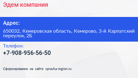 Эдем, компания по адресу 650032, Кемеровская область, Кемерово, 3-й Карпатский переулок, 2Б в дальнейшем Организация, размещена в следующих категориях: