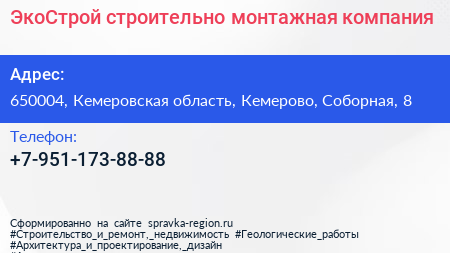 ЭкоСтрой, строительно-монтажная компания по адресу 650004, Кемеровская область, Кемерово, Соборная, 8 в дальнейшем Организация, размещена в следующих категориях:
