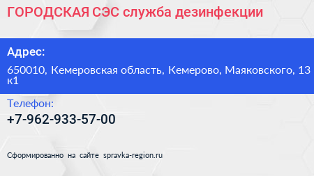 ГОРОДСКАЯ СЭС, служба дезинфекции по адресу 650010, Кемеровская область, Кемерово, Маяковского, 13 к1 в дальнейшем Организация, размещена в следующих категориях: