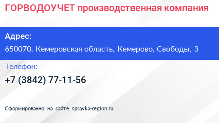 ГОРВОДОУЧЕТ, производственная компания по адресу 650070, Кемеровская область, Кемерово, Свободы, 3 в дальнейшем Организация, размещена в следующих категориях: