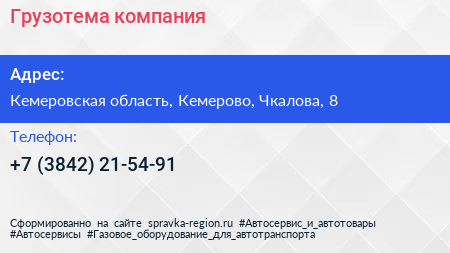 Грузотема, компания по адресу Кемеровская область, Кемерово, Чкалова, 8 в дальнейшем Организация, размещена в следующих категориях: