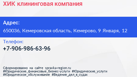 ХИК, клининговая компания по адресу 650036, Кемеровская область, Кемерово, 9 Января, 12 в дальнейшем Организация, размещена в следующих категориях: