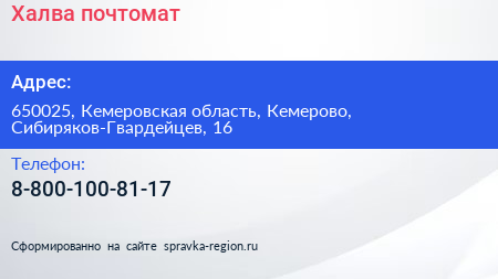 Халва, почтомат по адресу 650025, Кемеровская область, Кемерово, Сибиряков-Гвардейцев, 16 в дальнейшем Организация, размещена в следующих категориях: