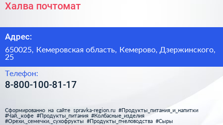 Халва, почтомат по адресу 650025, Кемеровская область, Кемерово, Дзержинского, 25 в дальнейшем Организация, размещена в следующих категориях: