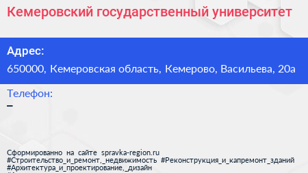 Кемеровский государственный университет по адресу 650000, Кемеровская область, Кемерово, Васильева, 20а в дальнейшем Организация, размещена в следующих категориях: