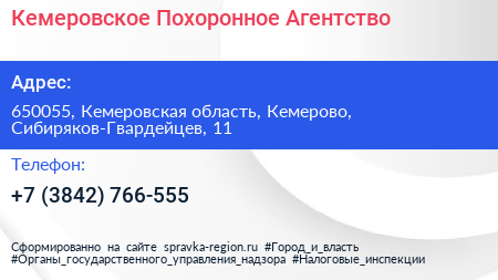 Кемеровское Похоронное Агентство по адресу 650055, Кемеровская область, Кемерово, Сибиряков-Гвардейцев, 11 в дальнейшем Организация, размещена в следующих категориях: