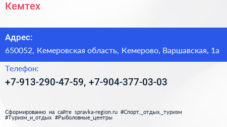 Кемтех по адресу 650052, Кемеровская область, Кемерово, Варшавская, 1а в дальнейшем Организация, размещена в следующих категориях:
