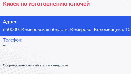 Киоск по изготовлению ключей по адресу 650000, Кемеровская область, Кемерово, Коломейцева, 10 в дальнейшем Организация, размещена в следующих категориях: