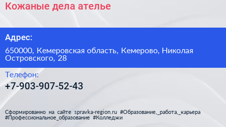 Кожаные дела, ателье по адресу 650000, Кемеровская область, Кемерово, Николая Островского, 28 в дальнейшем Организация, размещена в следующих категориях: