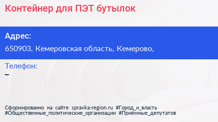Контейнер для ПЭТ бутылок по адресу 650903, Кемеровская область, Кемерово, в дальнейшем Организация, размещена в следующих категориях: