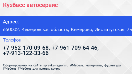 Кузбасс, автосервис по адресу 650002, Кемеровская область, Кемерово, Институтская, 7Б в дальнейшем Организация, размещена в следующих категориях: