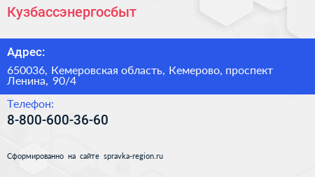 Кузбассэнергосбыт по адресу 650036, Кемеровская область, Кемерово, проспект Ленина, 90/4 в дальнейшем Организация, размещена в следующих категориях: