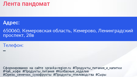 Лента, пандомат по адресу 650060, Кемеровская область, Кемерово, Ленинградский проспект, 28в в дальнейшем Организация, размещена в следующих категориях: