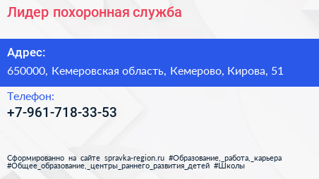 Лидер, похоронная служба по адресу 650000, Кемеровская область, Кемерово, Кирова, 51 в дальнейшем Организация, размещена в следующих категориях: