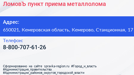 ЛомовЪ, пункт приема металлолома по адресу 650021, Кемеровская область, Кемерово, Станционная, 17 в дальнейшем Организация, размещена в следующих категориях: