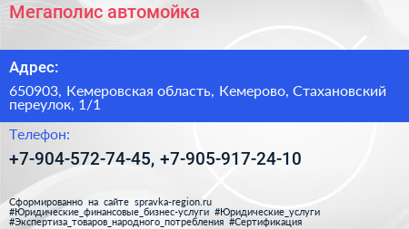Мегаполис, автомойка по адресу 650903, Кемеровская область, Кемерово, Стахановский переулок, 1/1 в дальнейшем Организация, размещена в следующих категориях: