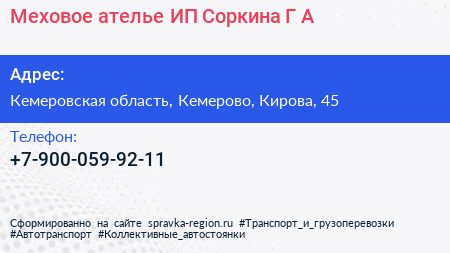 Меховое ателье, ИП Соркина Г.А. по адресу Кемеровская область, Кемерово, Кирова, 45 в дальнейшем Организация, размещена в следующих категориях:
