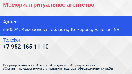 Мемориал, ритуальное агентство по адресу 650024, Кемеровская область, Кемерово, Базовая, 5Б в дальнейшем Организация, размещена в следующих категориях: