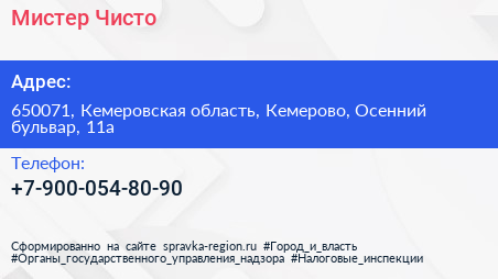 Мистер Чисто по адресу 650071, Кемеровская область, Кемерово, Осенний бульвар, 11а в дальнейшем Организация, размещена в следующих категориях: