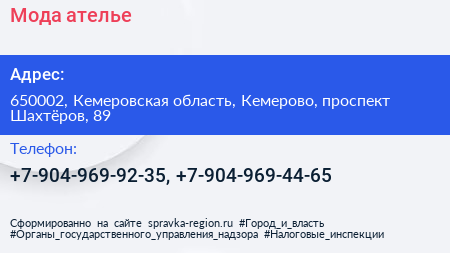 Мода, ателье по адресу 650002, Кемеровская область, Кемерово, проспект Шахтёров, 89 в дальнейшем Организация, размещена в следующих категориях:
