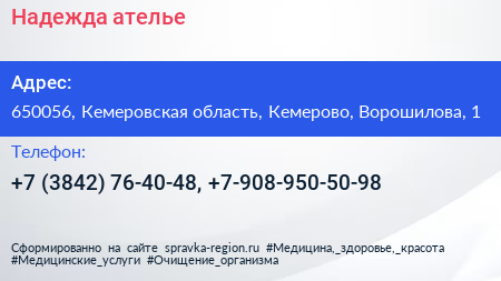 Надежда, ателье по адресу 650056, Кемеровская область, Кемерово, Ворошилова, 1 в дальнейшем Организация, размещена в следующих категориях: