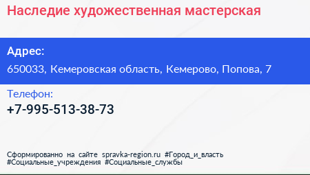Наследие, художественная мастерская по адресу 650033, Кемеровская область, Кемерово, Попова, 7 в дальнейшем Организация, размещена в следующих категориях: