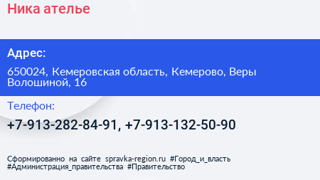 Ника, ателье по адресу 650024, Кемеровская область, Кемерово, Веры Волошиной, 16 в дальнейшем Организация, размещена в следующих категориях: