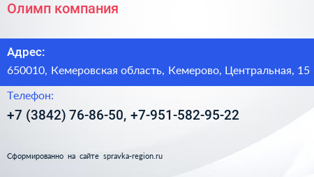 Олимп, компания по адресу 650010, Кемеровская область, Кемерово, Центральная, 15 в дальнейшем Организация, размещена в следующих категориях: