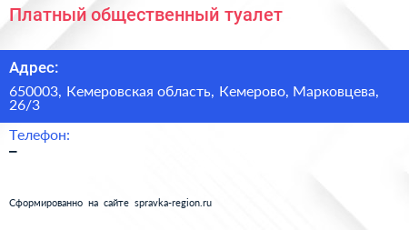 Платный общественный туалет по адресу 650003, Кемеровская область, Кемерово, Марковцева, 26/3 в дальнейшем Организация, размещена в следующих категориях: