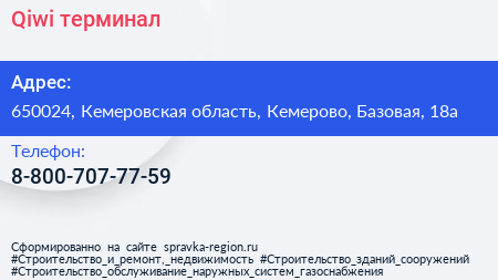Qiwi, терминал по адресу 650024, Кемеровская область, Кемерово, Базовая, 18а в дальнейшем Организация, размещена в следующих категориях: