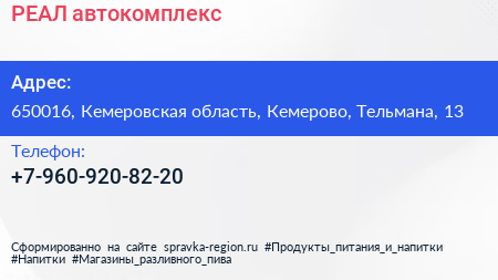 РЕАЛ, автокомплекс по адресу 650016, Кемеровская область, Кемерово, Тельмана, 13 в дальнейшем Организация, размещена в следующих категориях: