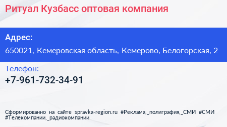 Ритуал Кузбасс, оптовая компания по адресу 650021, Кемеровская область, Кемерово, Белогорская, 2 в дальнейшем Организация, размещена в следующих категориях: