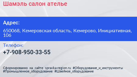 Шамэль, салон-ателье по адресу 650068, Кемеровская область, Кемерово, Инициативная, 106 в дальнейшем Организация, размещена в следующих категориях: