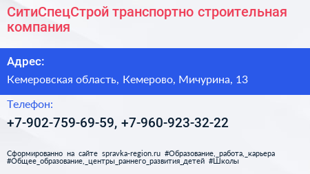 СитиСпецСтрой, транспортно-строительная компания по адресу Кемеровская область, Кемерово, Мичурина, 13 в дальнейшем Организация, размещена в следующих категориях: