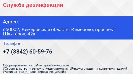 Служба дезинфекции по адресу 650002, Кемеровская область, Кемерово, проспект Шахтёров, 42а в дальнейшем Организация, размещена в следующих категориях: