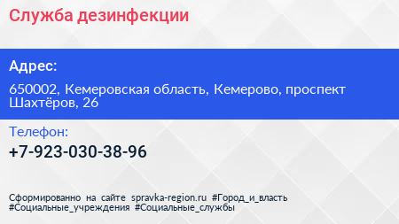 Служба дезинфекции по адресу 650002, Кемеровская область, Кемерово, проспект Шахтёров, 26 в дальнейшем Организация, размещена в следующих категориях: