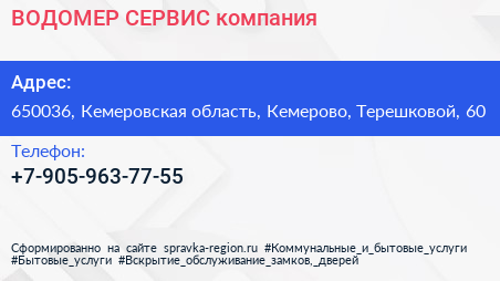 ВОДОМЕР СЕРВИС, компания по адресу 650036, Кемеровская область, Кемерово, Терешковой, 60 в дальнейшем Организация, размещена в следующих категориях: