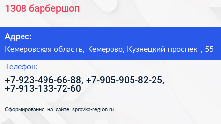 1308, барбершоп по адресу Кемеровская область, Кемерово, Кузнецкий проспект, 55 в дальнейшем Организация, размещена в следующих категориях: