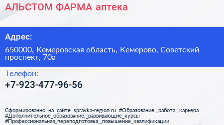 АЛЬСТОМ-ФАРМА, аптека по адресу 650000, Кемеровская область, Кемерово, Советский проспект, 70а в дальнейшем Организация, размещена в следующих категориях:
