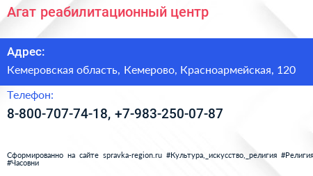 Агат, реабилитационный центр по адресу Кемеровская область, Кемерово, Красноармейская, 120 в дальнейшем Организация, размещена в следующих категориях: