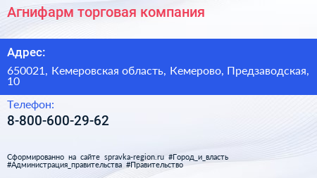 Агнифарм, торговая компания по адресу 650021, Кемеровская область, Кемерово, Предзаводская, 10 в дальнейшем Организация, размещена в следующих категориях:
