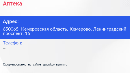 Аптека по адресу 650065, Кемеровская область, Кемерово, Ленинградский проспект, 16 в дальнейшем Организация, размещена в следующих категориях: