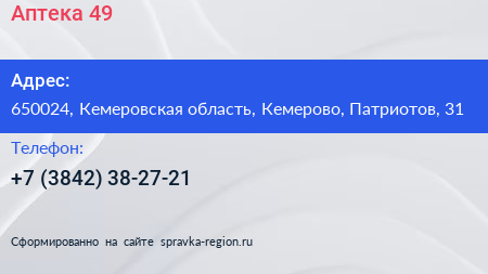 Аптека 49 по адресу 650024, Кемеровская область, Кемерово, Патриотов, 31 в дальнейшем Организация, размещена в следующих категориях: